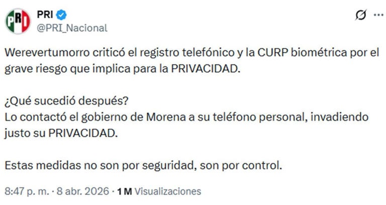 El Partido Revolucionario Institucional (PRI) reaccionó públicamente, criticando lo ocurrido y señalando un posible abuso en el manejo de datos personales.
